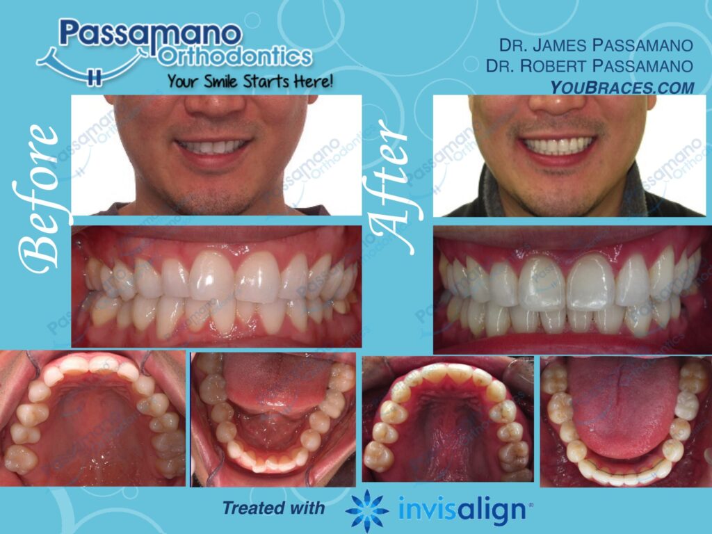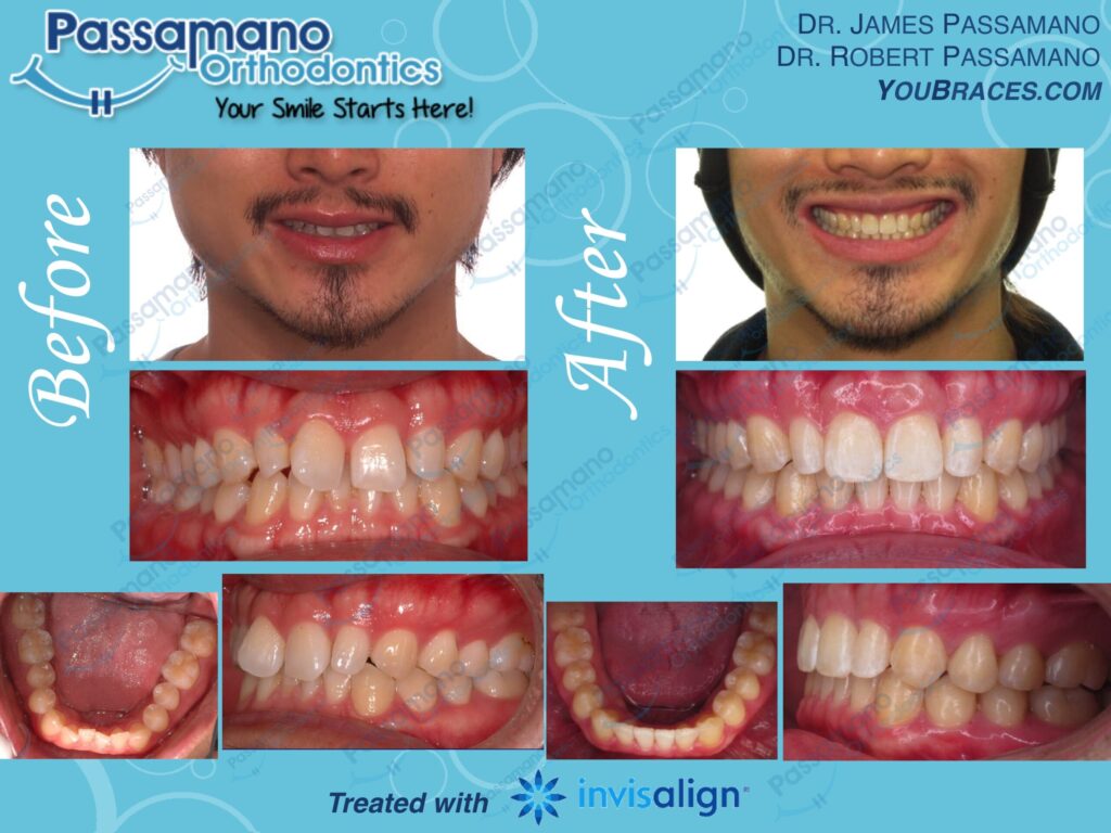 We fixed the upper incisor angulation from being ‘FLARED’ to ‘UPRIGHT’ position without removing teeth. When someone smiles, the angulation of the front teeth is important to the overall smile esthetics. This was treated in 16 months.