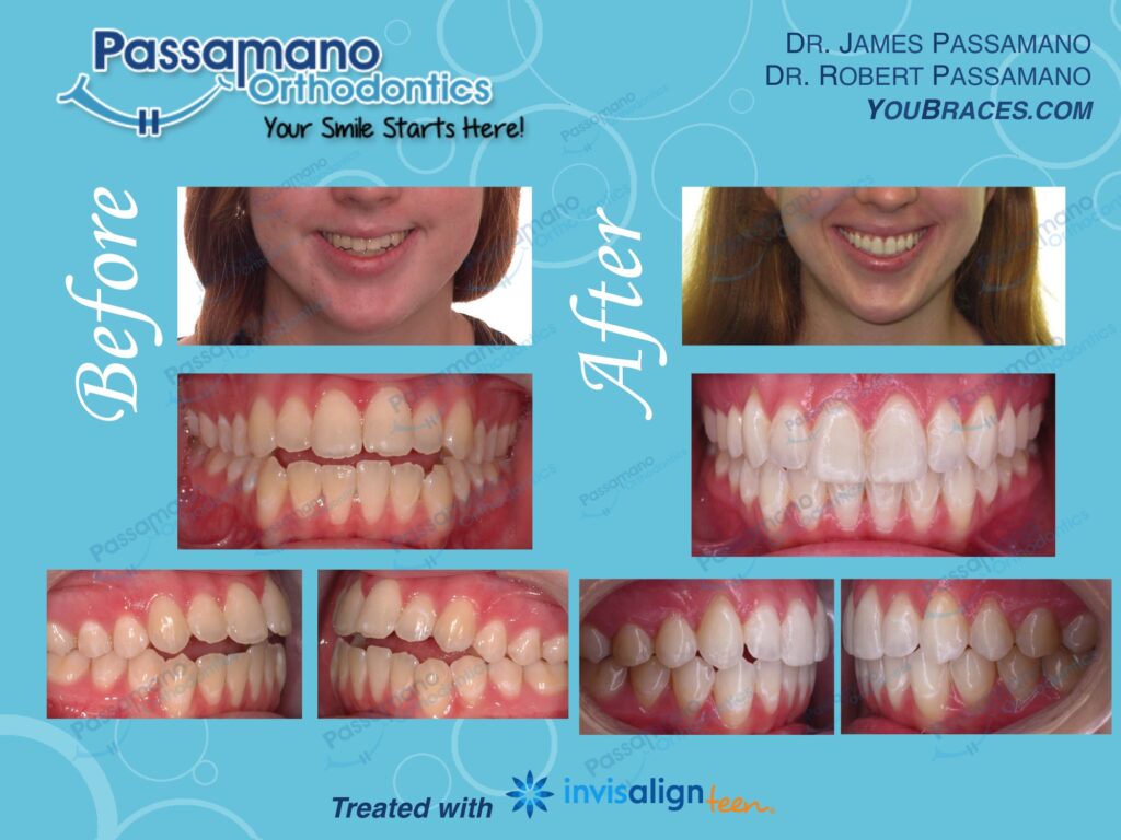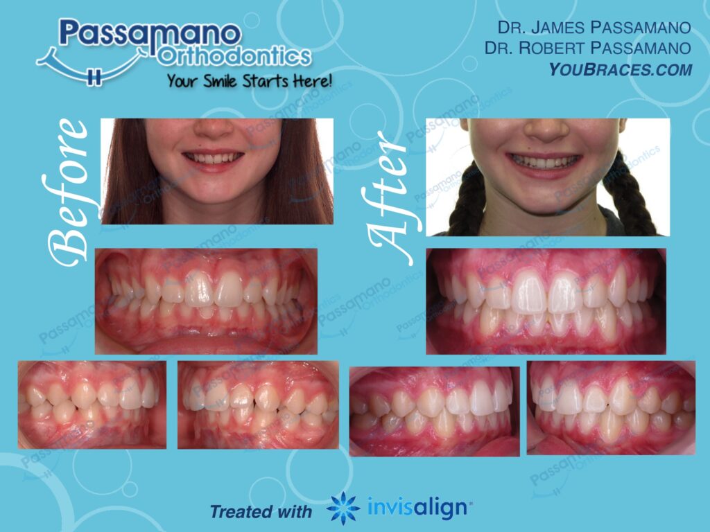 This female teen achieved both correction of the crowding and the correction of her bite. When looking at the patient’s left (the right side of the photo), you can see the bite correction to the proper interdigitation.